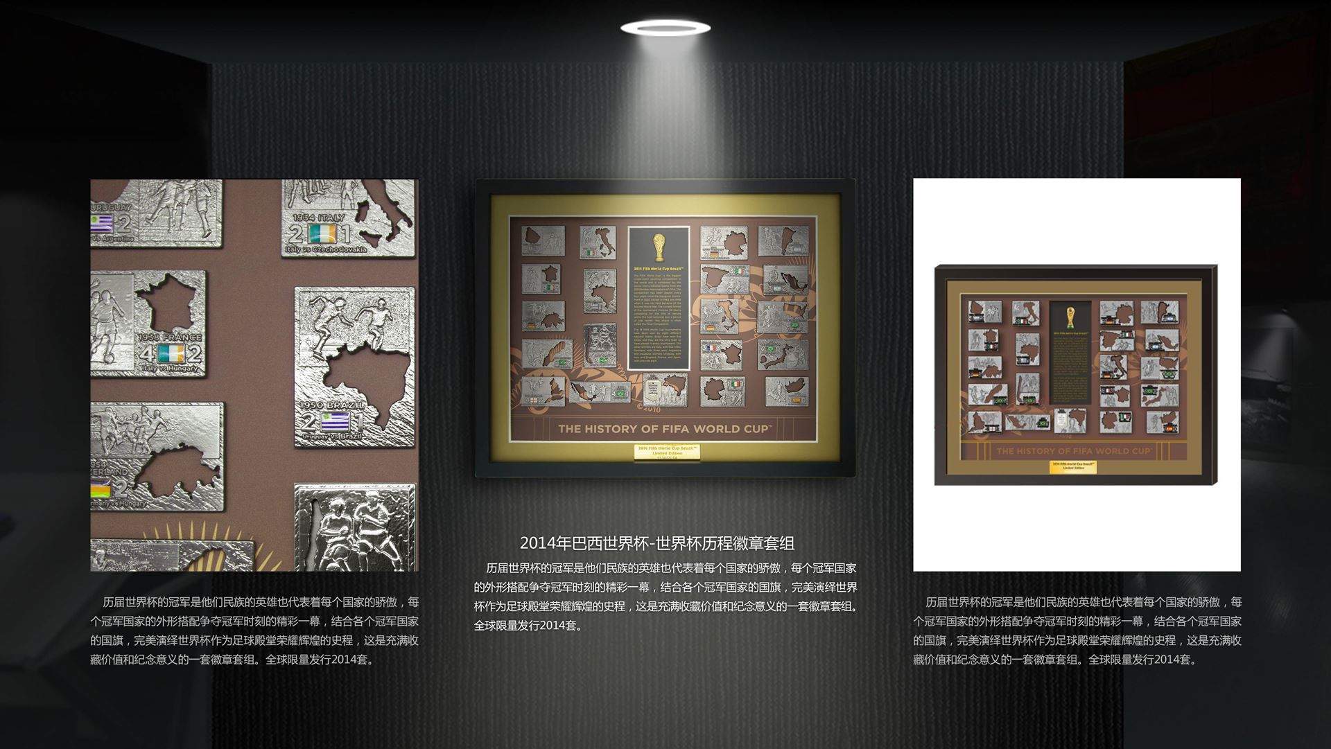 历届世界杯的冠军是他们民族的英雄也代表着每个国家的骄傲,每个冠军国家的外形搭配争夺冠军时刻的精彩一幕,结合各个冠军国家的国旗,完美演绎世界杯作为足球殿堂荣耀辉煌的史程,这是充满收藏价值和纪念意义的一套徽章套组。全球限量发行2014套。