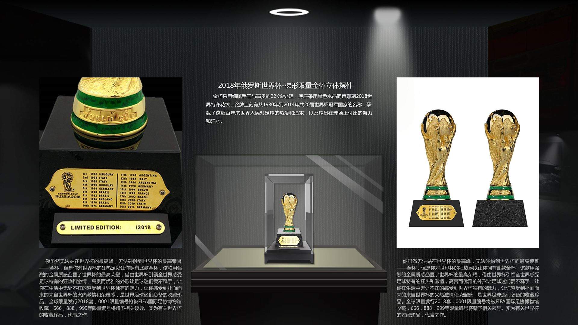 金杯采用细腻手工与高贵的22K金处理,底座采用黑色水晶同声雕刻2018世界特许花纹,铭牌上刻有从1930年到2014年共20届世界杯冠军国家的名称,承载了这近百年来世界人民对足球的热爱和追求,以及球员在球场上付出的努力和汗水。