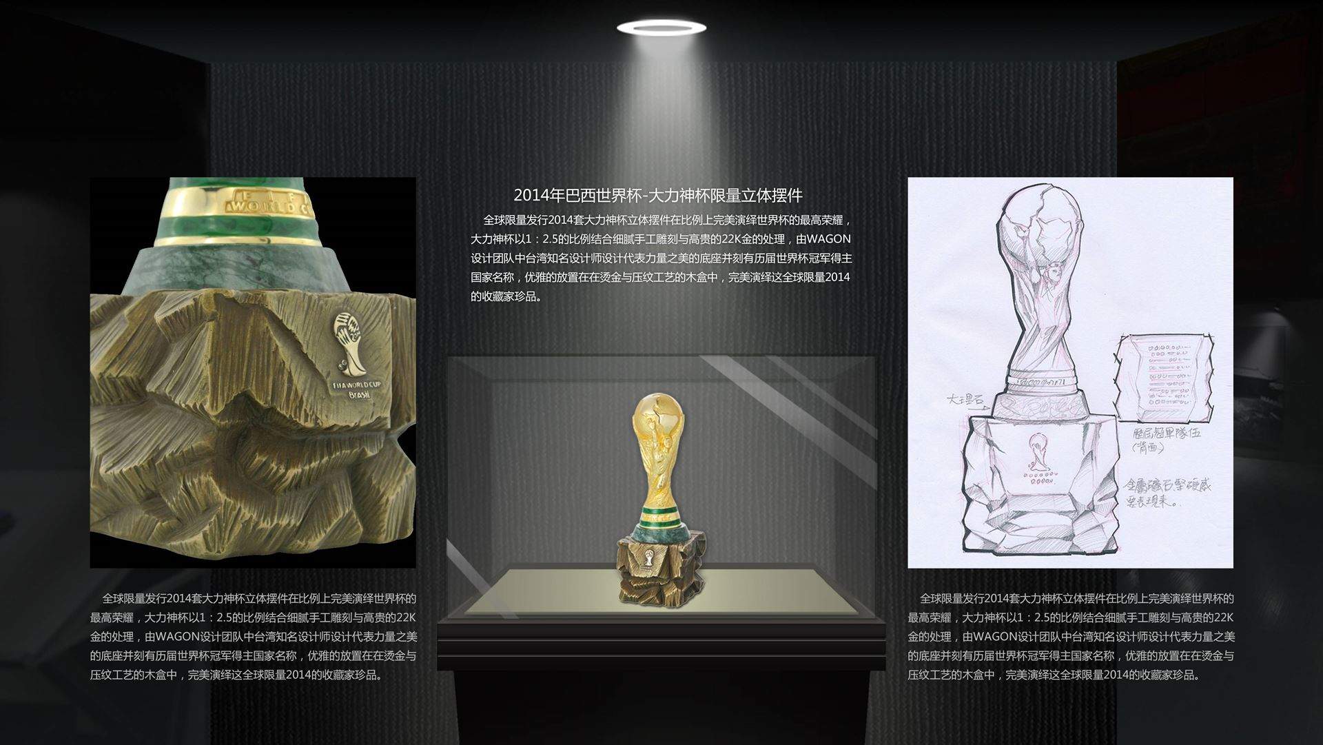 全球限量发行2014套大力神杯立体摆件在比例上完美演绎世界杯的最高荣耀,大力神杯以1:2.5的比例结合细腻手工雕刻与高贵的22K金的处理,由WAGON设计团队中台湾知名设计师设计代表力量之美的底座并刻有历届世界杯冠军得主国家名称,优雅的放置在在烫金与压纹工艺的木盒中,完美演绎这全球限量2014的收藏家珍品。